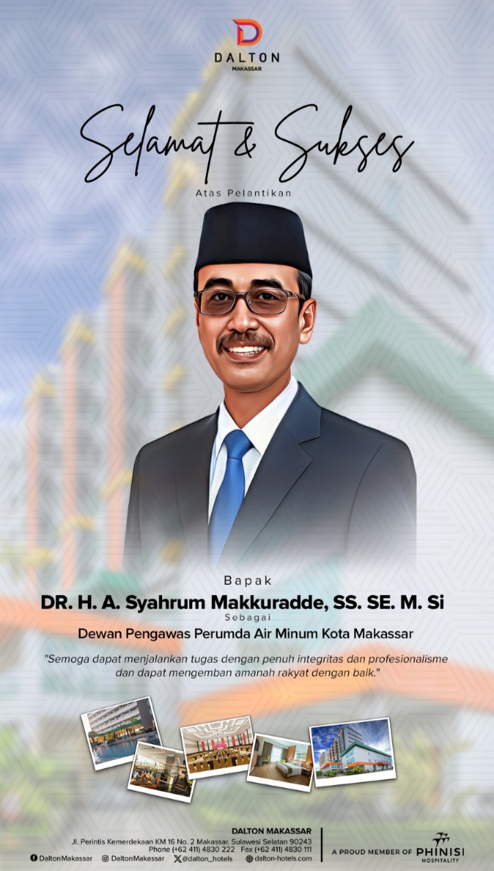 Salah satu yang turut dilantik adalah Andi Syahrum Makkuradde, yang kini resmi menjabat sebagai Anggota Dewan Pengawas PDAM Kota Makassar. Pelantikan ini menandai komitmen Pemerintah Kota Makassar dalam memperkuat tata kelola dan profesionalisme di tubuh BUMD.