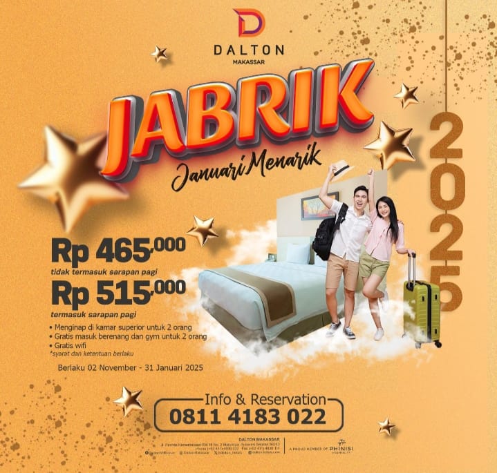 Mediasahabat.com-Makassar”Pasca Perayaan Tahun Baru 2025, Hotel Dalton Makassar menawarkan promo menarik bertajuk “ JABRIK ” Promo ini menjadi pilihan sempurna untuk warga Makassar yang ingin merayakan dan melanjutkan suasana Tahun Baru 2025 dengan suasana santai dan nyaman.