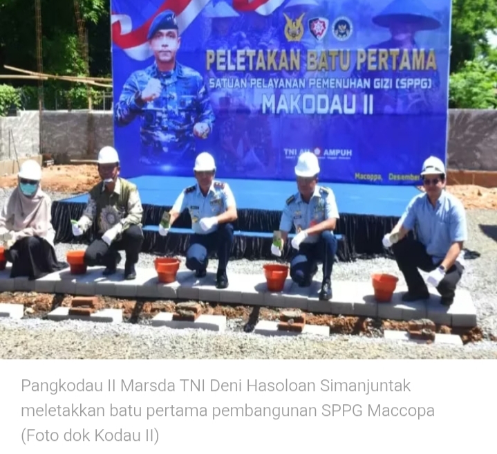 Mediasahabat.com-Maros,-“Komando Daerah Angkatan Udara II (Kodau II) resmi memulai pembangunan Satuan Pelayanan Pemenuhan Gizi (SPPG) di kawasan Maccopa, Kecamatan Turikale, Kabupaten Maros, Kamis (11/12/2025). Peletakan batu pertama dipimpin langsung oleh Pangkodau II, Marsda TNI Deni Hasoloan Simanjuntak, pada pukul 11.10 Wita.