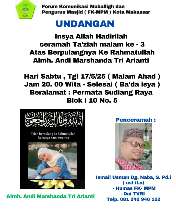 Mediasahabat.com-Makassar-“ Keluarga besar dan masyarakat sekitar berkumpul dalam suasana haru pada malam takziah ke-3 atas meninggalnya almarhumah Andi Marshanda, korban yang meninggal dunia akibat terbawa arus sungai di Tompo Bulu, Kabupaten Maros. Acara ini berlangsung di Kompleks Permata Sudiang Raya (PSR), Kelurahan Laikang, Kecamatan Biringkanaya, Makassar.Sabtu 17/5/2025