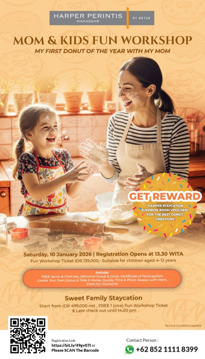 Selain pengalaman berharga dan momen kebersamaan, peserta juga berkesempatan mendapatkan reward berupa Voucher Staycation Superior Room di Harper Perintis Makassar bagi hasil kreasi donat terbaik.