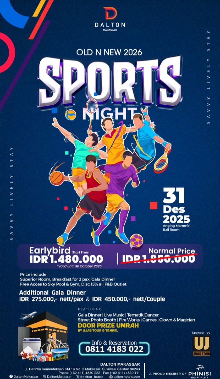 “Konsep Sports Night kami pilih karena ingin menghadirkan semangat baru yang penuh energi untuk menyambut tahun 2026. Kami ingin para tamu menikmati malam pergantian tahun dengan suasana yang berbeda, fun, dan berkesan,” ujar General Manager Hotel Dalton Makassar, (nama GM), Jumat (24/10/2025).