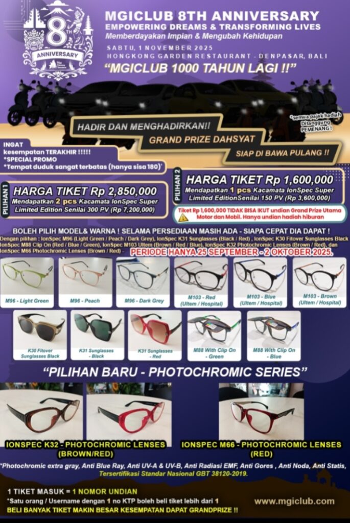 Peserta mendapatkan 2 pcs kacamata IonSpec Super Limited Edition senilai 300 PV (Rp 7.200.000) dan berhak mengikuti undian grand prize utama.