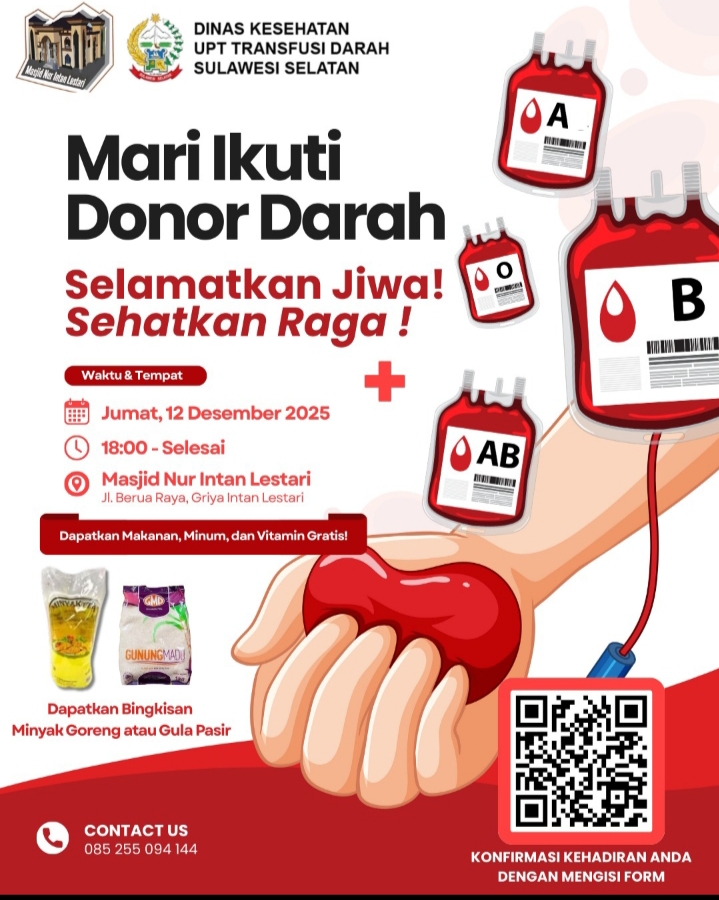 Mediasahabat.com-Makassar,-“Pengurus Masjid Nur Intan Lestari kembali mengadakan kegiatan donor darah rutin bekerja sama dengan UPT Transfusi Darah Dinas Kesehatan Sulawesi Selatan. Kegiatan ini akan berlangsung pada Jumat, 12 Desember, di area Masjid Nur Intan Lestari.