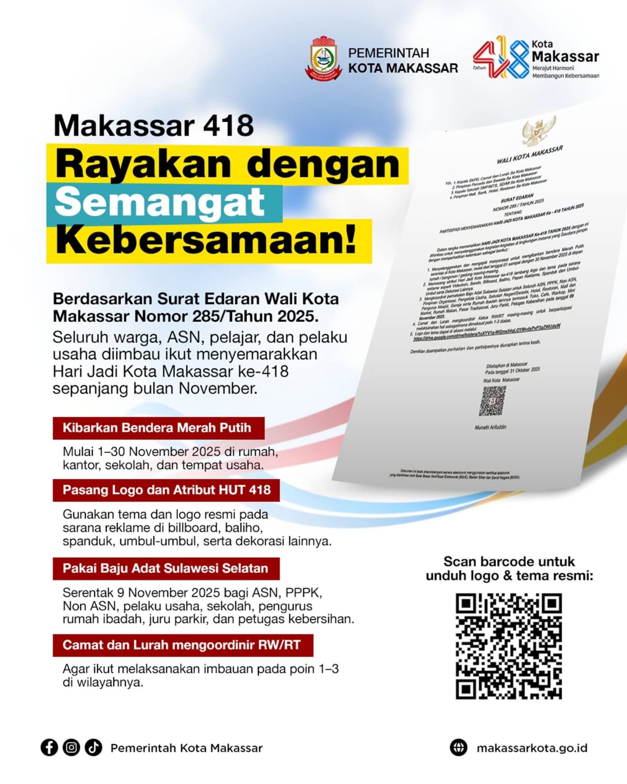 Pemkot Makassar mengajak seluruh masyarakat untuk ikut bergembira dan berpartisipasi aktif dalam berbagai kegiatan olahraga, hiburan, dan aksi sosial yang dikemas secara inklusif dan penuh semangat kebersamaan.