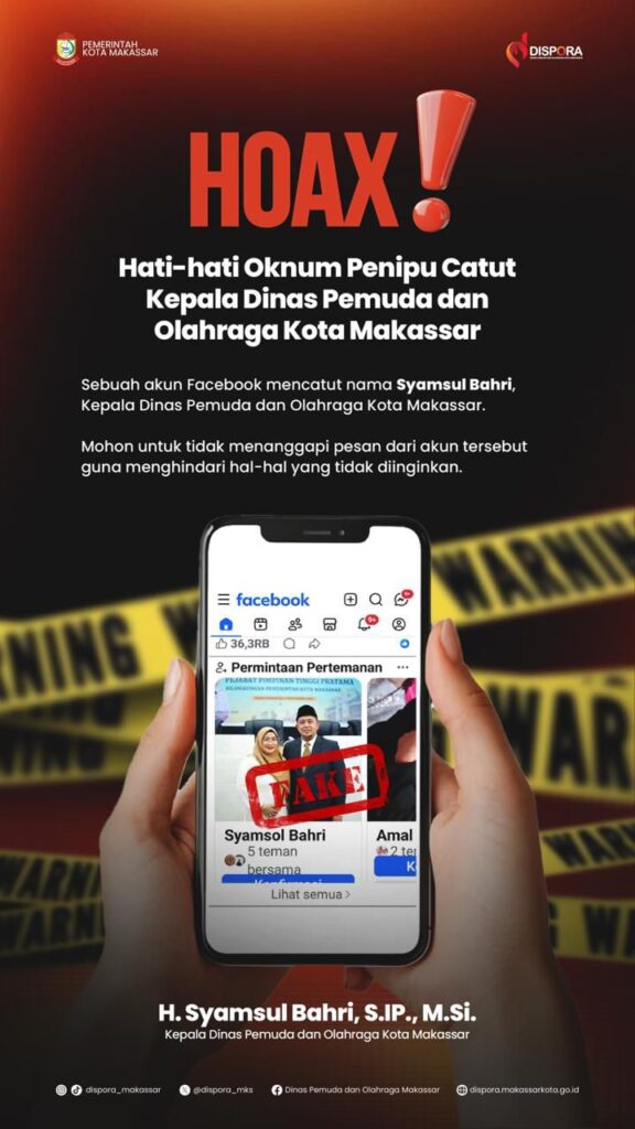 Mediasahabat.com-Makassar, —” Dinas Pemuda dan Olahraga (Dispora) Kota Makassar menegaskan bahwa akun Facebook yang mengatasnamakan Kepala Dinas Pemuda dan Olahraga Kota Makassar, H. Syamsul Bahri, S.IP., M.Si., adalah tidak benar (hoaks) dan merupakan upaya penipuan oleh oknum yang tidak bertanggung jawab.