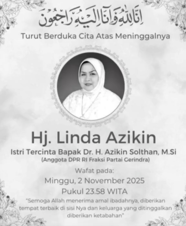 Mediasahabat.com-Makassar, 3 November 2025,-“Kabar duka datang dari keluarga besar Anggota DPR RI Fraksi Partai Gerindra, Dr. H. Azikin Solthan, M.Si. Istri tercinta beliau, Hj. Linda Azikin, berpulang ke Rahmatullah pada Minggu, 2 November 2025 pukul 23.58 WITA.