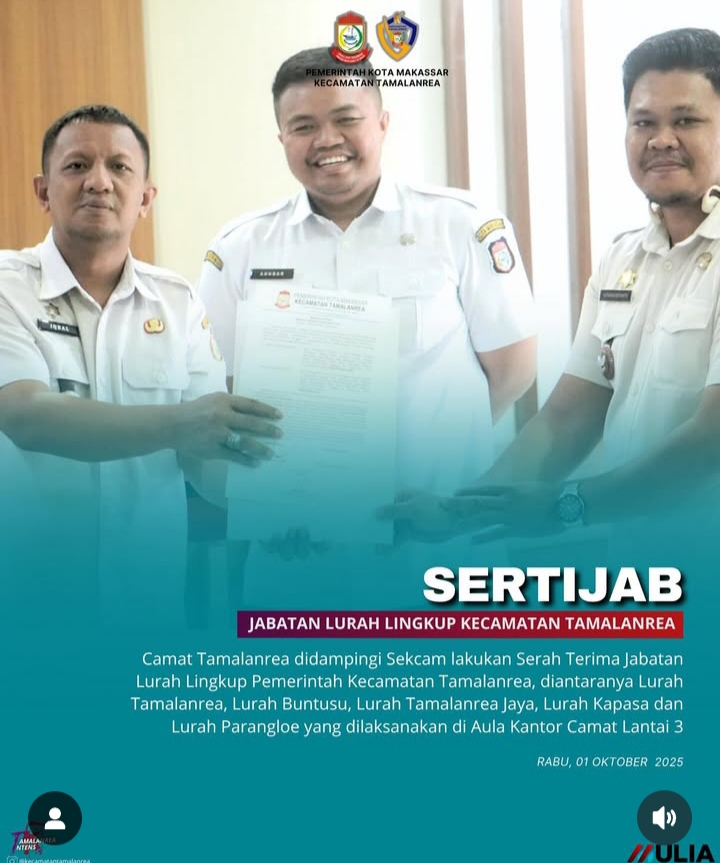 Dalam kesempatan tersebut, Camat Tamalanrea menyampaikan bahwa kegiatan serah terima jabatan ini merupakan bagian dari upaya memastikan kelancaran pelaksanaan tugas pemerintahan serta peningkatan pelayanan kepada masyarakat di wilayah Kecamatan Tamalanrea.