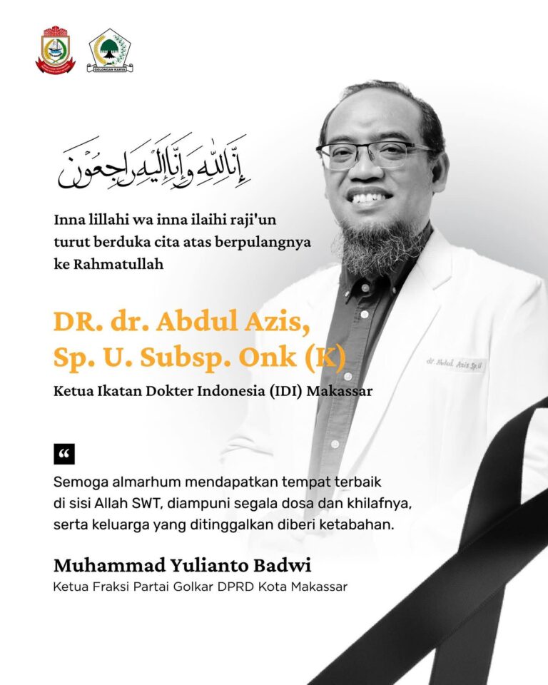 “Atas nama keluarga dan Fraksi Partai Golkar DPRD Makassar, saya menyampaikan duka cita yang sangat mendalam atas wafatnya DR. dr. Abdul Azis. Saya pribadi sangat mengenal almarhum, sosok yang rendah hati, hangat, dan memiliki kepedulian luar biasa terhadap dunia kedokteran dan kesehatan,” ujar Yulianto Badwi, Sabtu (2/11/2025).