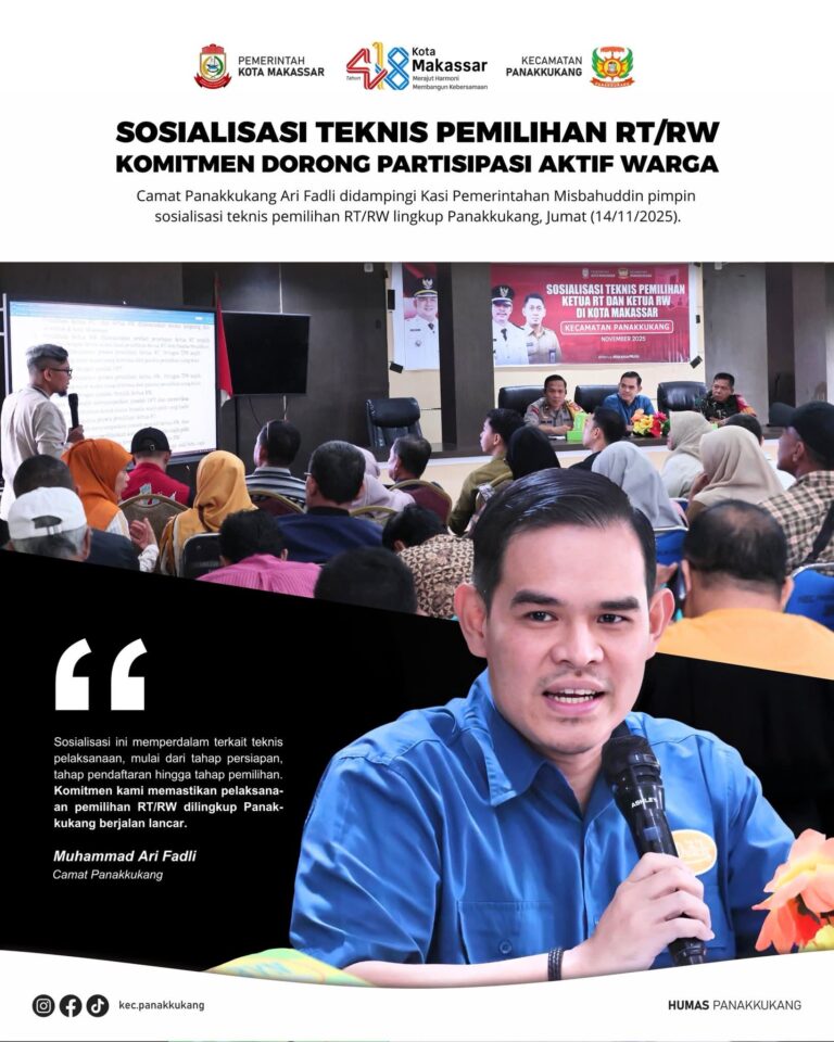 Mediasahabat.com-Makassar ,–” Pemerintah Kecamatan Panakkukang menggelar sosialisasi teknis pemilihan Ketua RT dan Ketua RW se-Kecamatan Panakkukang pada Jumat (14/11/2025). Kegiatan ini dilaksanakan sebagai langkah persiapan untuk memastikan seluruh tahapan pemilihan berjalan sesuai prosedur.