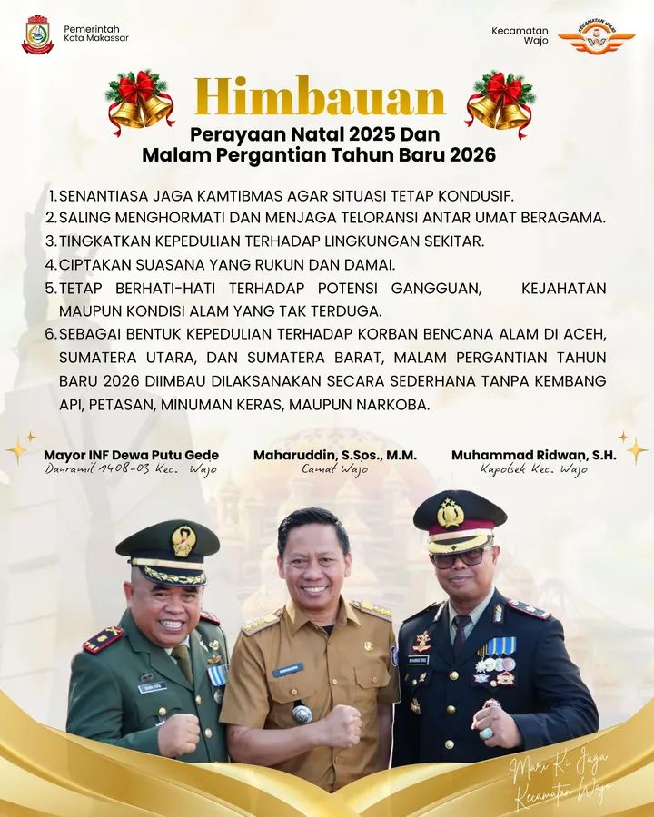 Melalui himbauan ini, Tripika Kecamatan Wajo berharap seluruh elemen masyarakat dapat berperan aktif dalam menjaga keamanan dan ketertiban, sehingga Perayaan Natal 2025 dan Malam Tahun Baru 2026 dapat berlangsung dengan aman, tertib, dan penuh kebersamaan.