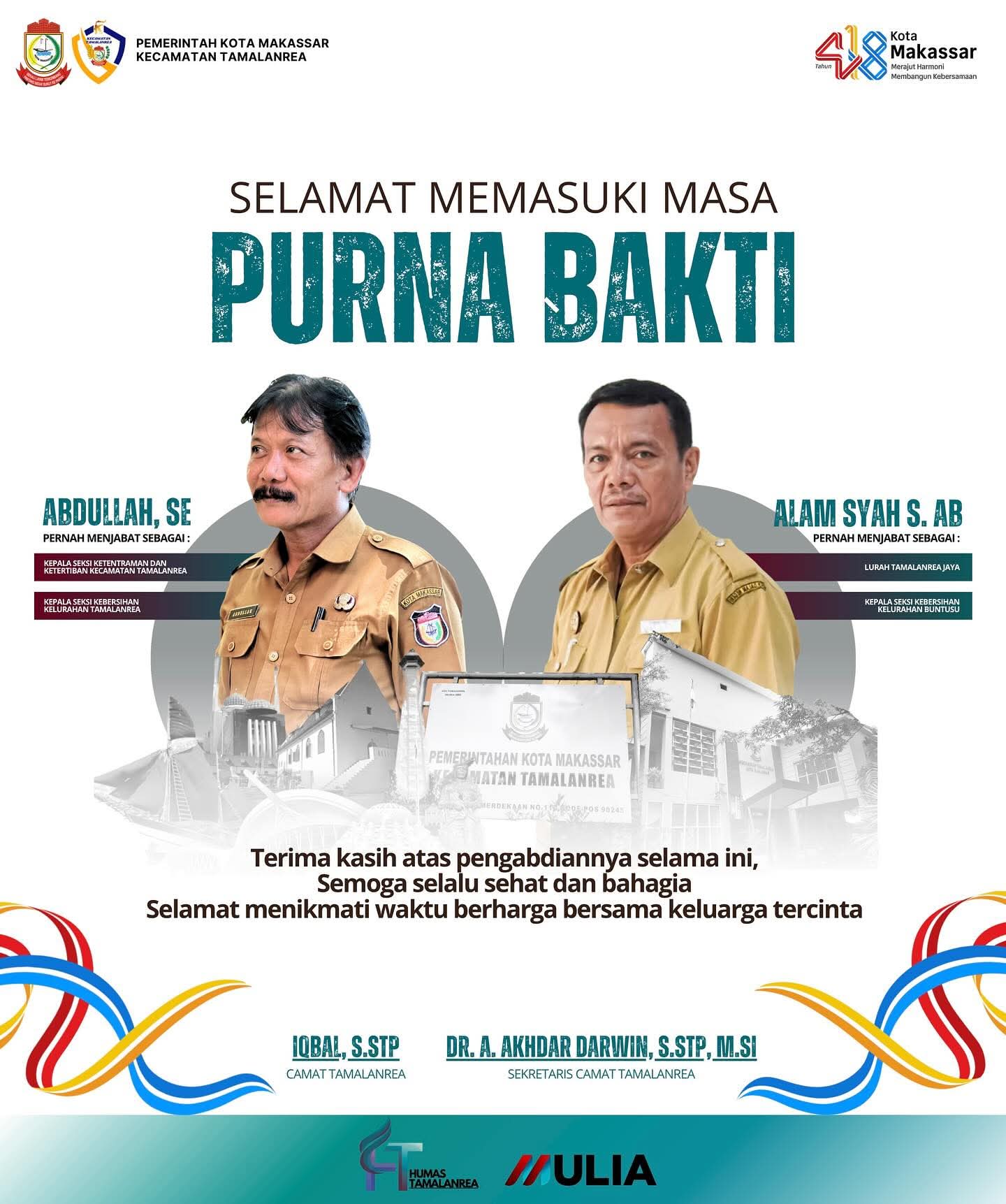 Keduanya yakni Abdullah, SE dan Alam Syah S, AB, yang selama bertahun-tahun telah mengabdikan diri di lingkungan Pemerintah Kecamatan Tamalanrea dengan penuh dedikasi dan tanggung jawab.