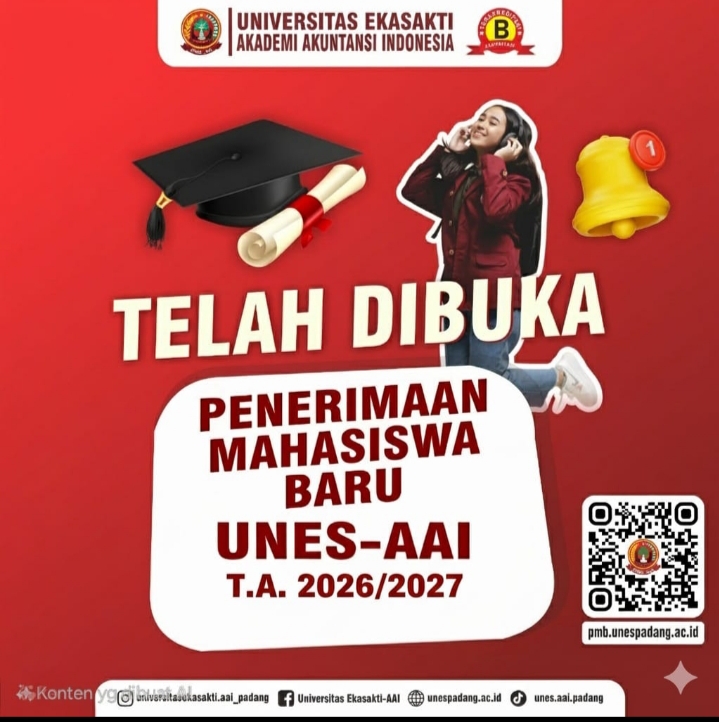 Mediasahabat.com-Padang,“Universitas Ekasakti – Akademi Akuntansi Indonesia (UNES-AAI) kembali membuka kesempatan bagi generasi muda Indonesia untuk melanjutkan pendidikan tinggi melalui Penerimaan Mahasiswa Baru (PMB) Tahun Akademik 2026/2027. Pembukaan ini menjadi momentum penting bagi para lulusan SMA/SMK dan sederajat yang ingin mengembangkan potensi akademik serta keterampilan profesional di bidang ekonomi, akuntansi, dan ilmu terapan lainnya.