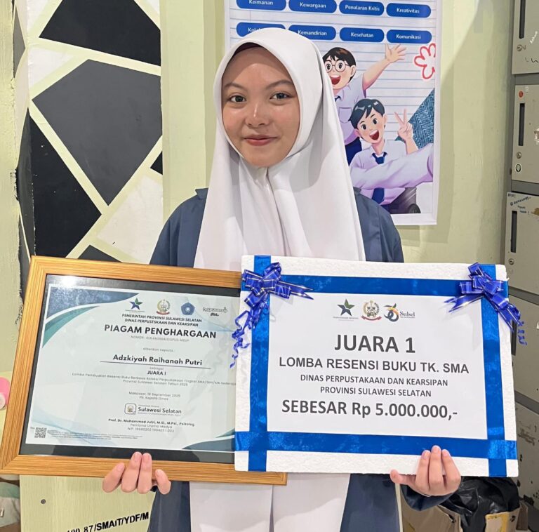 Beranda » Susun Redaksi » Siswi Berprestasi, Adzkiyah Raihanah Putri Sabet Juara 1 Lomba Resensi Buku se-Sulawesi Selatan