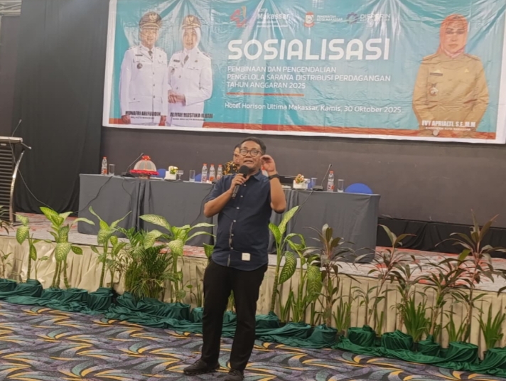 Mediasahabat. com-Makassar,-“Direktur Utama Perumda Pasar Makassar Raya, Ali Gauli Arief, menjadi salah satu pemateri dalam kegiatan Sosialisasi Pembinaan dan Pengendalian Pengelola Sarana Distribusi Perdagangan yang digelar oleh Dinas Perdagangan Kota Makassar, Kamis (30/10/2025).